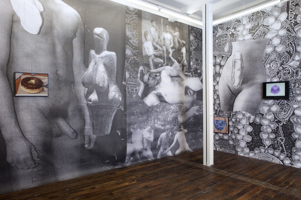 On pense également – peut-être pas par hasard – à l’arme à feu que Marvin Gaye avait offerte à son père trois mois avant que celui-ci ne lui tire dessus avec et ne le tue. Le phallus comme arme qui se retourne contre lui-même. C’est sous l’étendard de cette étoile déchue que s’est placée Alalia Chetwynd, en changeant son nom dans un premier temps pour Spartacus Chetwynd, puis dans un second temps (lorsque les proches avaient enfin avalé la couleuvre et commencé à s’habituer à ce prénom de gladiateur de la Rome Antique) pour Marvin Gaye Chetwynd. Symbolique acte, là aussi, d’auto-invention. « Je n’ai jamais eu de problème avec le prénom que m’ont donné mes parents » dit-elle à un journaliste du Guardian. « Mais j’avais besoin d’un nom plus robuste ». Elle ajoute plus loin : « les artistes devraient vivre de façon expérimentale, selon moi ; j’ai donc testé cette idée facile à mettre en place, histoire de voir ça donnerait. » Dans la galerie, les papiers peints de Marvin Gaye sont une digression sur la représentation des corps et de leurs parties, par collage de photographies en noir et blanc découpées et assemblées avec humour. Une charmante guirlande de fesses de femmes blanches et rebondies se termine (comme sa plus belle perle) par les fesses noires et tout aussi rebondies d’un fétiche qui semble porter un string et qui dont le buste se prolonge dans la forme d’un pénis. L’artiste, qui s’est fait connaître pour ses performances absurdes et grandioses et ses films déjantés, mêle constamment masculin et féminin, moins par militantisme queer que par curiosité et esprit d’expérimentation, dans une tradition plus surréaliste que politique.