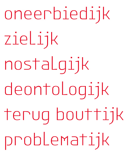 J’ai été frappé de la proximité de ton travail avec certains travaux de Cassandre. On ne peux s’empêcher de penser avec tes Quantanje ou tes Sintetik aux universalistes écritures systématiques de Schwitters ou opto-phonétique de Tschichold, la distance nostalgico-critique en plus. On sent chez toi ce même goût de la typographie expressive et ludique… C’est, du reste, si j’ai bien compris, ce qui avait motivé en partie ton choix au Stedelijk. Cette proximité avec le travail de Sandberg.