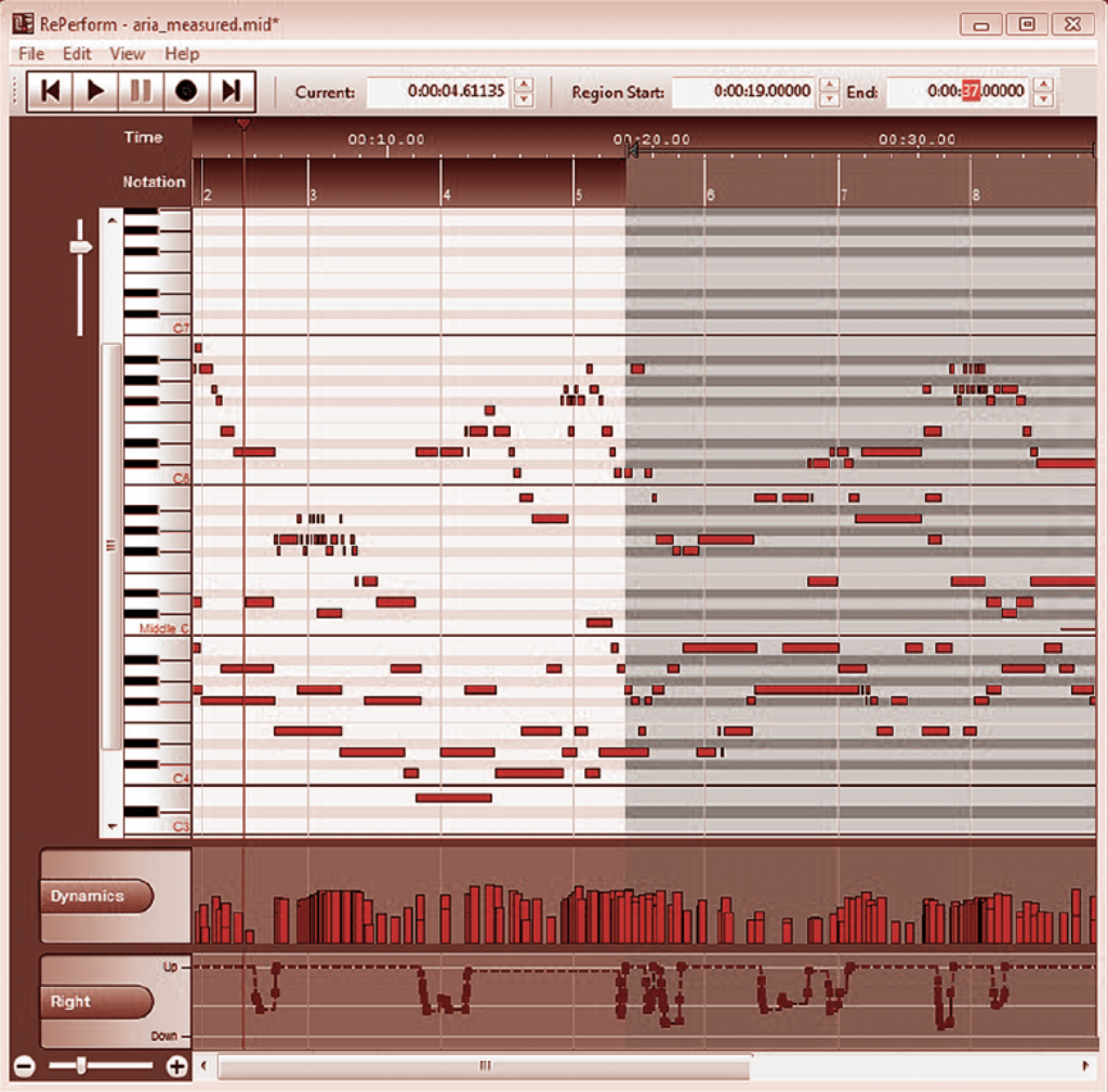 Visualisation possible d’une séquence MIDI dans un éditeur musical : les notes sont présentées sur le même axe que les touches du clavier à gauche.