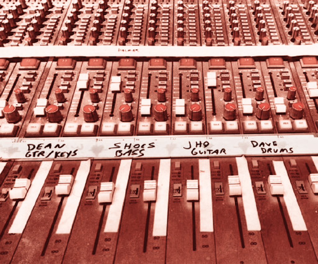 Exemple d’une table de mixage ( détail du bas ) avec ses tranches, potentiomètres et surtout, sa bande de rouleau adhésif sur laquelle sont inscrits les noms des musiciens auxquels se rattachent les pistes sonores et leurs paramètres respectifs.