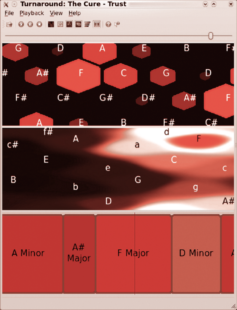 En haut, les notes sont groupées sur une grille afin de faire ressortir la structure de l’accord. En bas, le nom de l’accord détecté est affiché sur la tête de lecture.