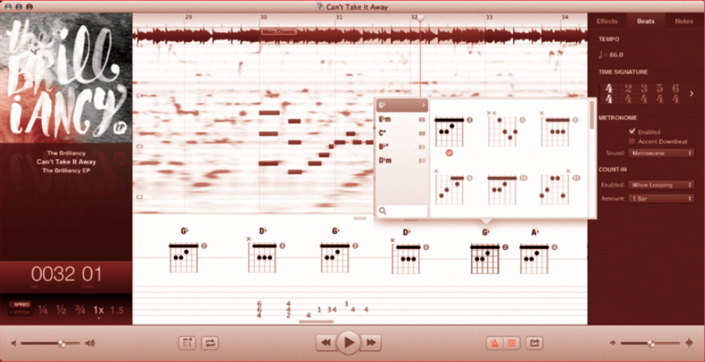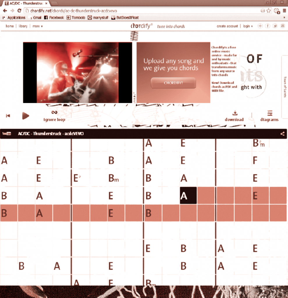Ici, l’aspect ne se focalise pas tant sur l’analyse que sur la pratique instantanée du morceau joué. Sur une seule page, tous les éléments nécessaires à l’interprétation sont disponibles et générés de manière automatique. Le site reconnait les accords des chansons ( mp3, vidéoclip, concert… ) qui lui sont soumises via une adresse internet et les synchronise avec la musique sur un simple lecteur multimédia. Les accords ou la tablature générés sont mis en évidence à la lecture du morceau retranscrit dans le player et la sélection se déplace en cours de chanson. Cliquer sur n’importe quel accord emmène directement à cette partie de la chanson et pour faciliter l’apprentissage d’un passage, il est possible de créer une boucle, de ralentir… Ces outils multimédia interactifs convoquent une interface complète digne des logiciels de montage vidéo mais offrent surtout un contrôle presque total sur le déroulement de l’apprentissage du morceau.
