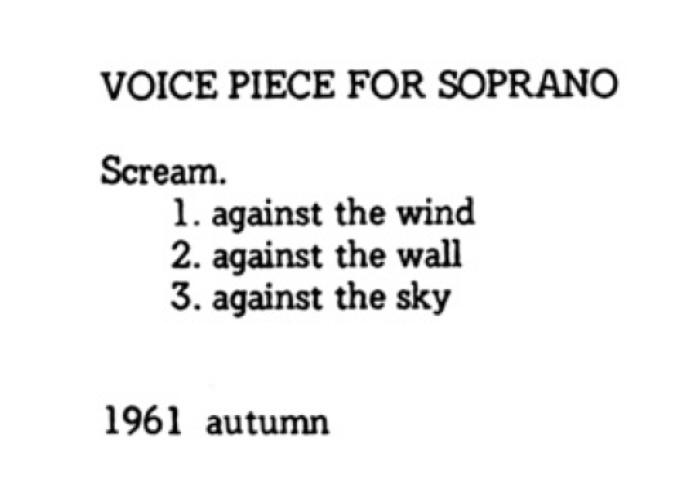 Yoko Ono présente sa Voice Piece for Soprano de 1961 comme une consigne et ses variantes, à l’aide d’un seul caractère.