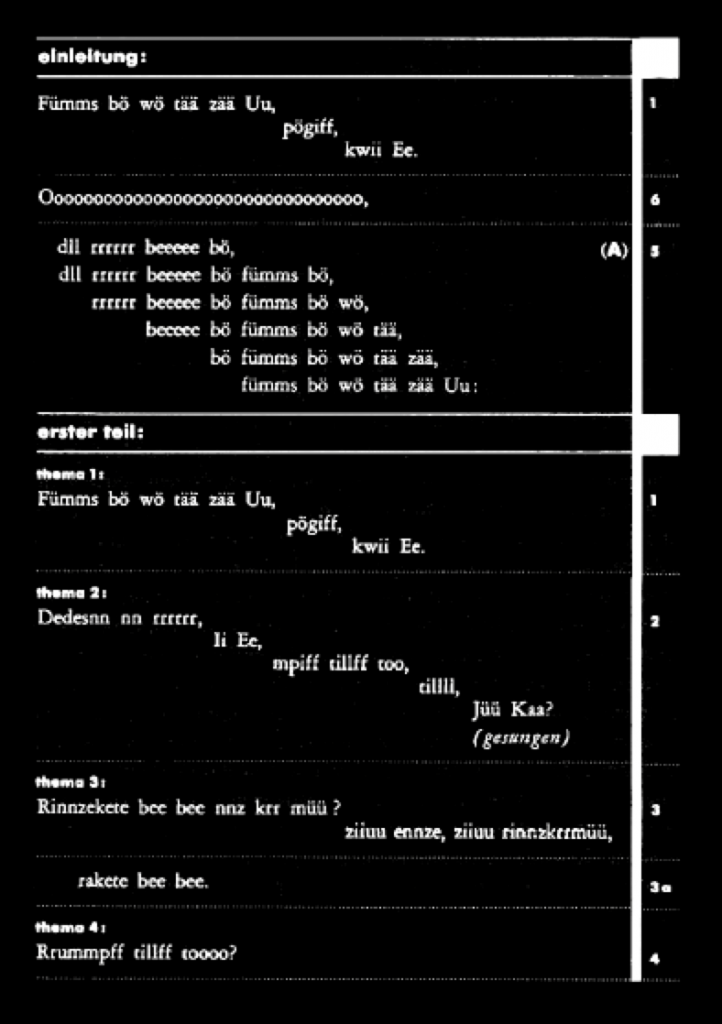 La typographie laisse donc transparaître la musicalité de l’œuvre sans artifice. Le plus bel exemple reste à ce jour celui de Jan Tschichold, pour la mise en page de l’Ursonate de Kurt Schwitters (1887-1948). Son travail a servi de base à de nombreuses œuvres d’autres artistes, car il met en pratique ce que les travaux du Bauhaus bâtissent autour de la fonctionnalité de la lecture. Dans ce cas, l’enjeu mis en lumière par l’emploi du texte, réside dans la gestion fonctionnelle de la mise en page. Tschichold propose une solution à la fois technique, sensible et innovante. Lui-même explique le système : «Dans un rythme libre, les paragraphes et la ponctuation sont utilisées comme dans la langue, pour un rythme rigoureux, les barres de mesure ou les indications de mesure apparaissent par la division proportionnée en sections spatiales égales de l’espace typographique, mais pas de ponctuation. Donc, [les signes] , . ; ! ? : ne sont lus que pour la tonalité.