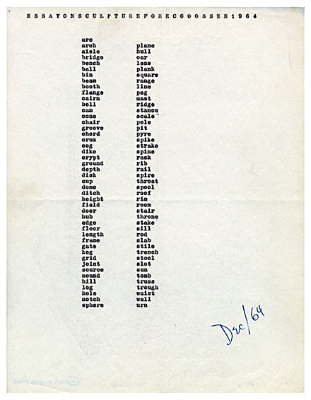 Carl Andre, “Essay on Sculpture for EC Goossen,” Typewriter carbon on paper. 10 7 8 x 8 3 8”. © Carl Andre Licensed by VAGA, New York, NY. Courtesy Paula Cooper Gallery, New York.