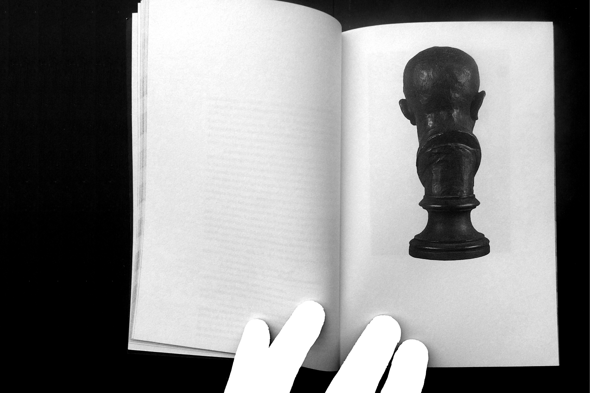 La ronde bosse (buste, en bronze, des collections du Petit Palais) est sans autre réalité ici que celle de sa reproduction photographique imprimée-déposée sur le recto d’un feuillet (une ronde bosse inframince ?)