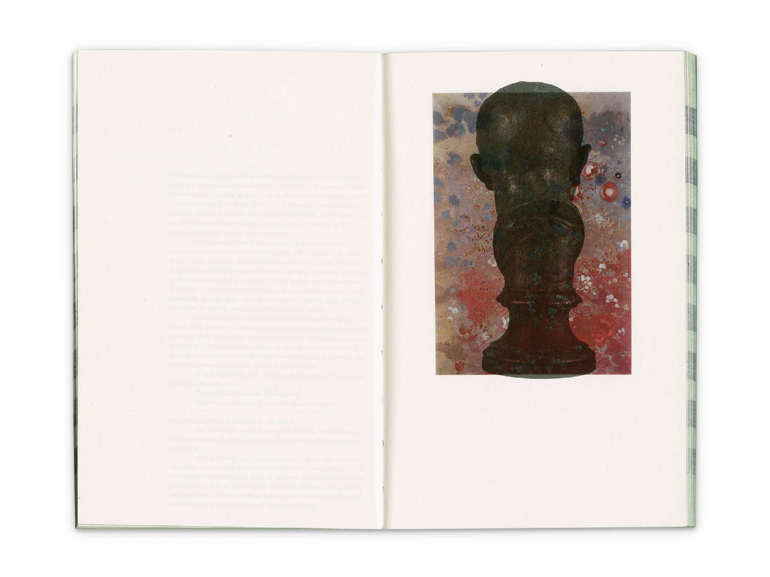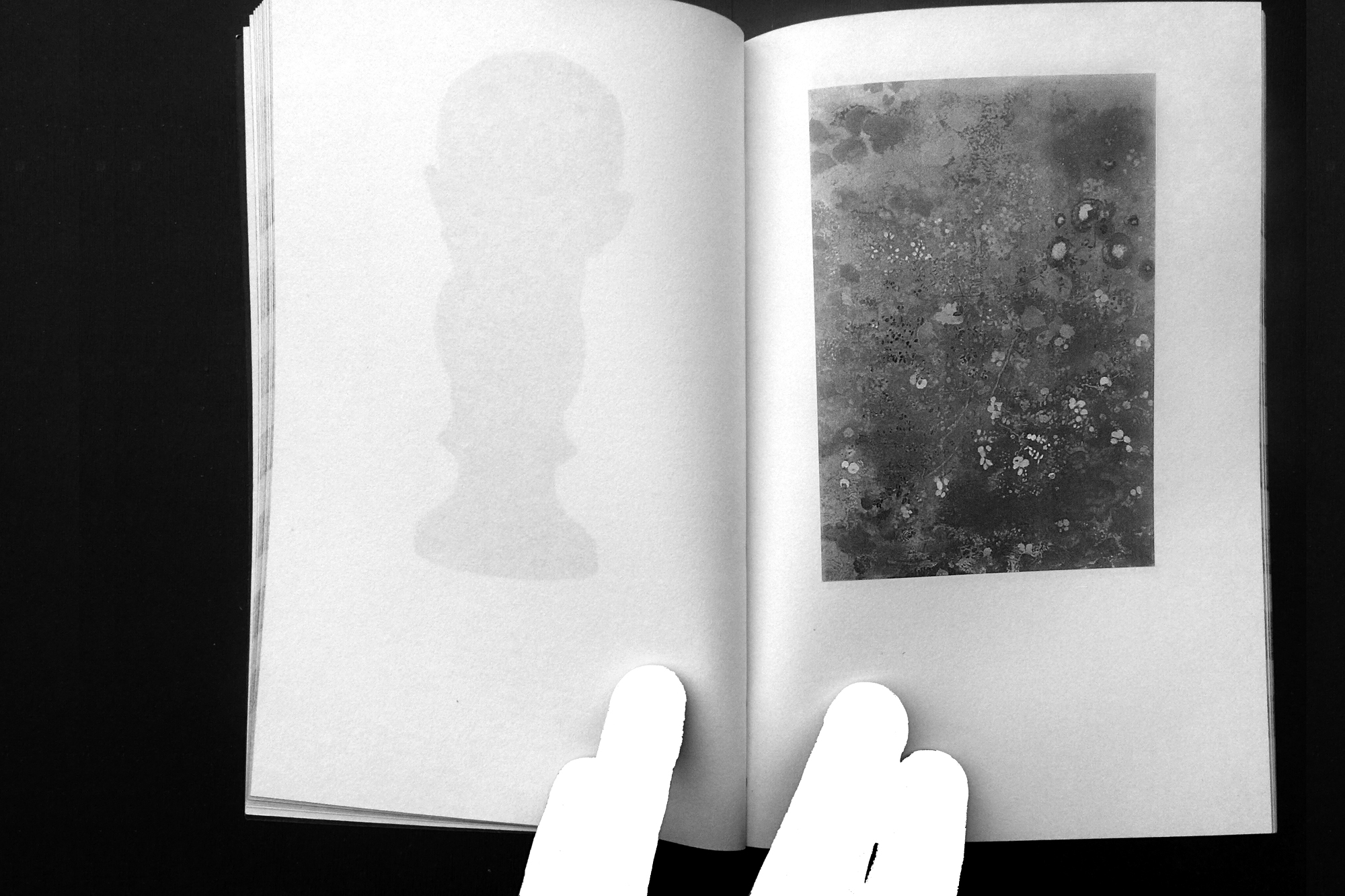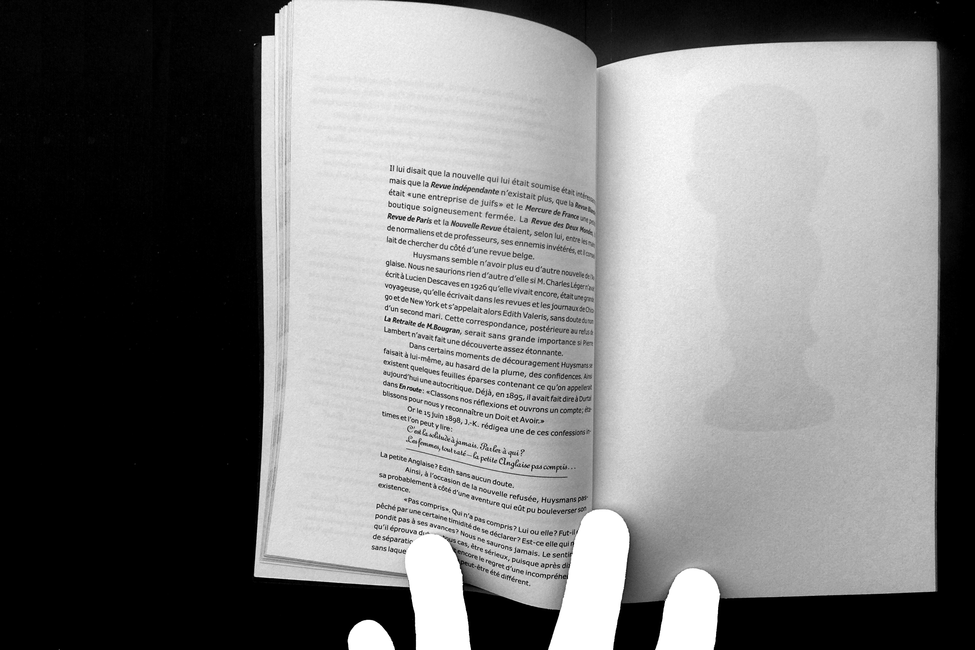 *en consultant la boutique en ligne ichetkar, mi-août 2023, la donne a changé : l’exemplaire du livre affiché à l’écran ne dispose plus ses matériaux de façon semblable à celui qui est lu21 . La constitution du livre varie. La surimpression noire du buste de J.-K. H. sur le panneau d’O. R. semble insister davantage sur le montage – ou une condensation (comme dans un rêve) – que sur l’identification J.-K. H.-lecteurice-Bougran. La surimpression ne joue plus autant du dispositif tournant des pages. Mais ce nouveau montage fantasme le buste, l’allège encore d’un degré – tout en nous retirant ce que l’impression sur le seul recto d’un feuillet tendait à exprimer : le croisement de dispositions matérielles et d’une autre fiction au sein du livre. L’imaginaire ne joue plus de la même manière dans et avec le livre. L’image spectrale du buste par la réduction de la ronde-bosse à une fragile couche d’impression – comme un fumage surréaliste (cf. Wolfgang Paalen, inventeur du fumage, vers 1936-37)22 – déplace l’accent sur la facture graphique. La qualité fantasmatique de la scène provient de la superposition des images et de la répétition du panneau (surimprimé puis non) des pages 25 à 28 (ce qu’aura confirmé la prise en main de cet autre exemplaire).