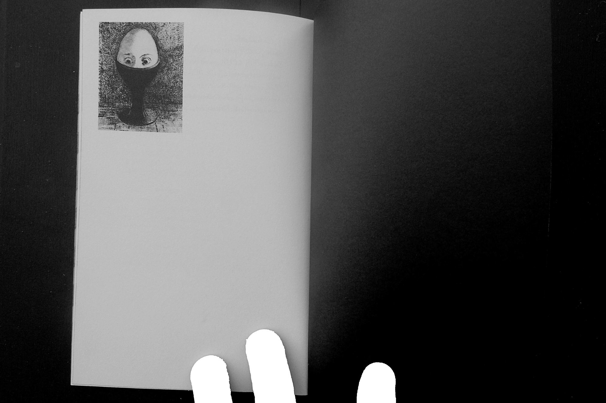 *le colophon, inscrit en tête du premier folio de la page ultime, au recto, tandis qu’au verso Odilon Redon fournit la figure fantasque d’une petite tête à briser (portée par le pied d’un coquetier, semblable au piedouche du buste concocté par P.R. pour son ami J.-K. H.). Le coco hissé complète d’une vue la ronde-bosse dont le premier aperçu, de dos, était donné en p. 25. Un portrait à rebours, en quelque sorte (comme la distribution du matériel iconographique sur les couvertures de la collection « Rouge-gorge »). 32