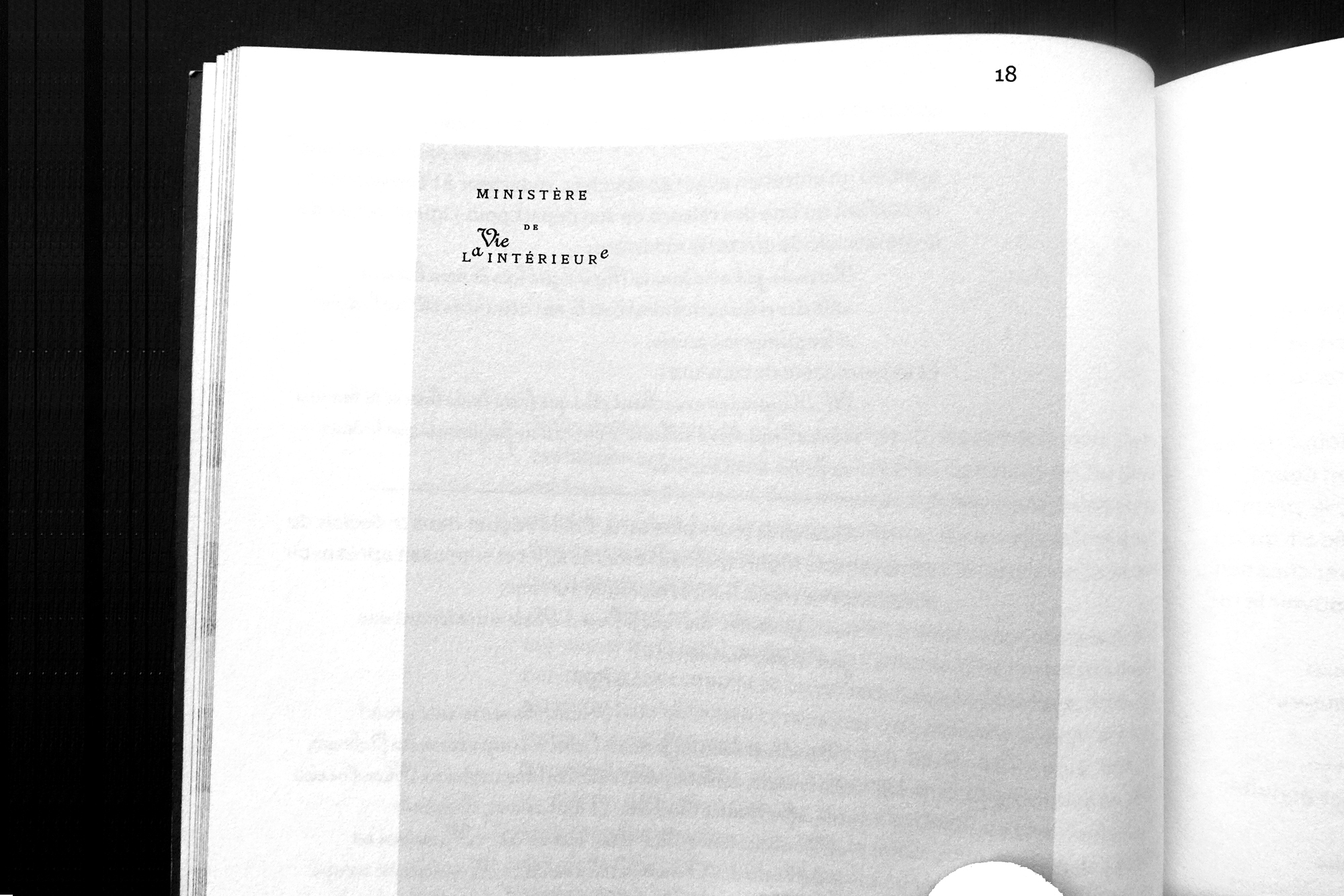 Les tranches, et ici plus particulièrement la gouttière, peintes ou non font surface, livre fermé – au moins28 . Qu’elles se délitent à la lecture du livre, découpent l’image ou le motif qui s’y trouvent appliqués n’en affecte pas définitivement l’apparence. Les tranches constituent des surfaces mobiles, élastiques, altérables et recomposables. Motifs ou images s’en émeuvent et comme les reflets sur une flaque cinglée au passage. Ce qui s’y trouve imprimé en reçoit un don de fragilité, mais il se double de la simple magie à éprouver perte et retour d’une figure, entraperçue. Par sa régularité, ce tour place la jaspure en contrepoint du récit. Sa discrétion, sa naïveté bordent avec douceur la causticité du texte de Joris-Karl. Aux abords du Ministère palpite un cœur d’oiseau.