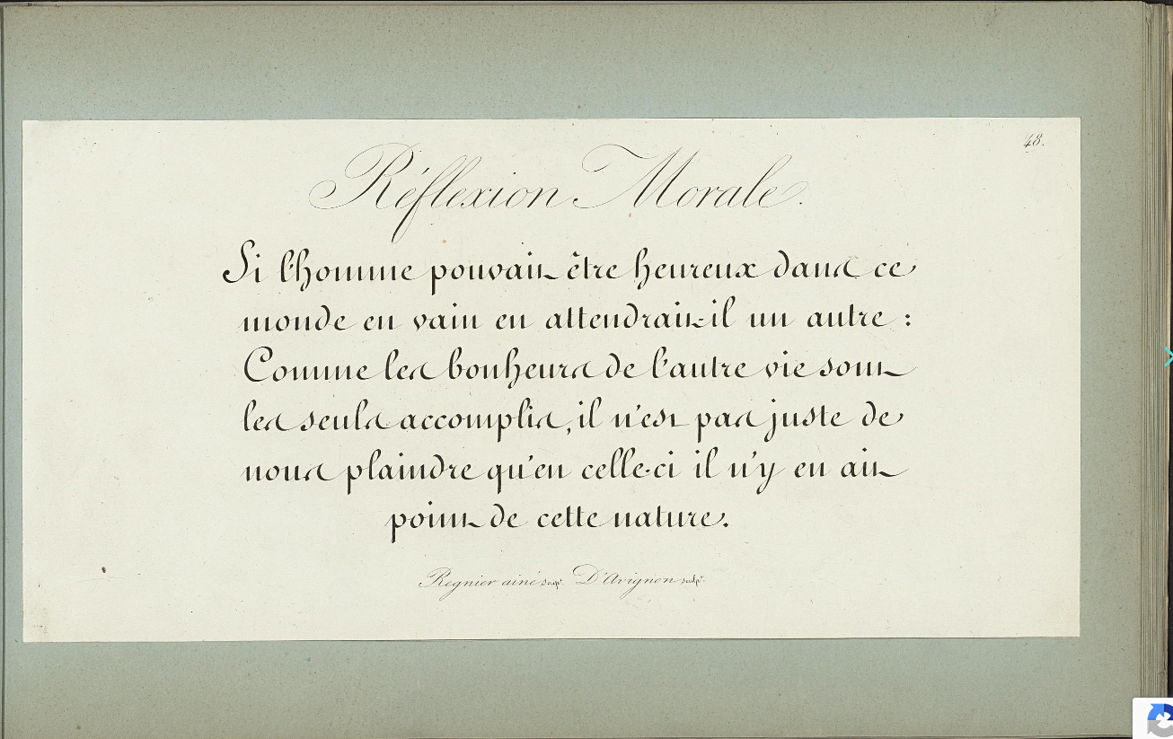 modèle d’écriture dite «Ronde» (les bonheurs de l’autre vie sont les seuls accomplis), planche extraite de la Méthode Générale d’Écriture par Régnier aîné, 1842, Colas Imprimeur, Paris