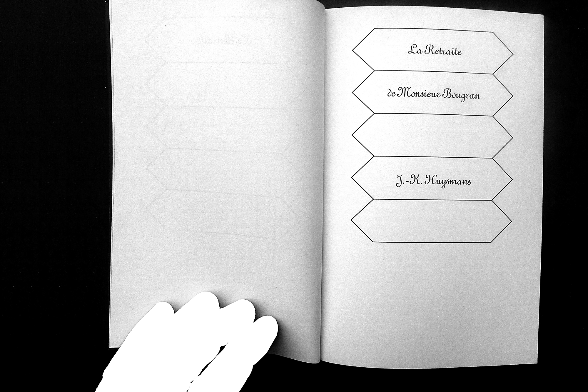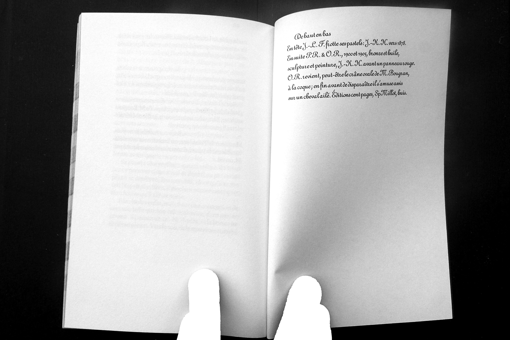 J.-K. H. à contrejour & panneau d’O. R., p. 26-27, de l’exemplaire N°1, «La Retraite de Monsieur Bougran», éditions CENT PAGES, 2020