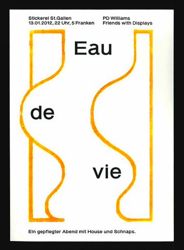 Flyer announcing a party with house music and liquor. The lines are hand printed. In collaboration with Andrea RĂĽeger.