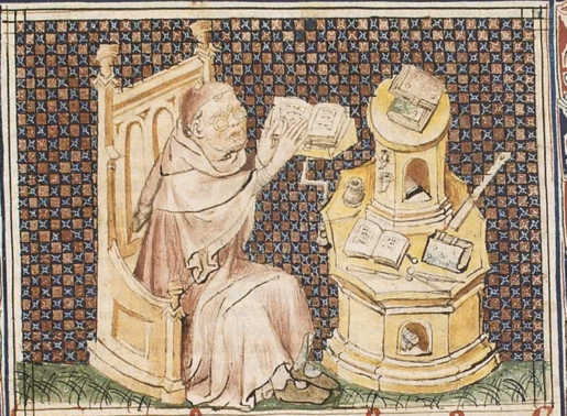 Cette enluminure est au folio 29 du Livre du TrĂ©sor commandĂ© par Pierre de Hauteville, prince d’amour de la Cour amoureuse de Charles VI. On y voit l’auteur, Brunetto Latini, Ă son pupitre. La peinture a peut ĂŞtre Ă©tĂ© rĂ©alisĂ©e Ă Lille, après 1418. Elle est conservĂ©e Ă Bruxelles, Bibliothèque royale Albert Ier.