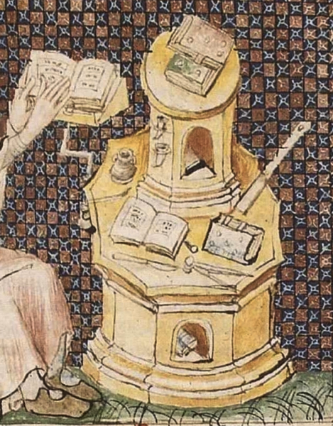 Le meuble qui nous intéresse est une roue à livres. Le premier plateau est octogonal, celui du haut est rond. Des livres ouverts et fermés y sont posés. Sur l’axe du meuble, qui comporte une niche, on voit accroché à l’extérieur, sur l’une des faces, deux cornes-encriers fixés par une lanière. Sur le plateau, un compas, un couteau, une plume, une règle un petit pot à deux anses, et une petite corne noire (?).