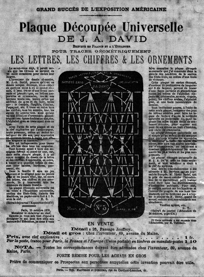 Pas de commentaires Plaque découpée universelle, par Thierry Chancogne Les commentaires sont fermés. http://www.drieswiewauters.eu/ J.-A. David, Plaque découpée universelle, 1876http://ms-gaillarde.blogspot.fr/2011/02/plaque-decoupee-universelle.htmlhttp://www.reading.ac.uk/typography/about/staff/e-t-kindel.aspx 26 / 03 / 13