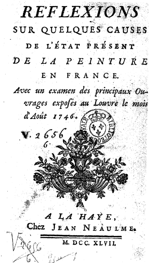 Réflexions sur quelques causes de l’état présent de la peinture en France. Avec un examen des principaux Ouvrages exposés au Louvre le mois d’Août 1746, à La Haye, chez Jean Neaulme, 1747.