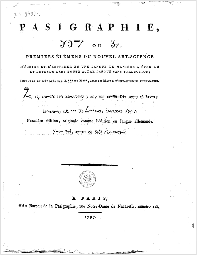 Joseph de Maimieux, Pasigraphie ou Premiers éléments du nouvel art-science, d’écrire et d’imprimer en une langue, de manière à être lu et entendu dans toute autre langue sans traduction, Paris, 1797