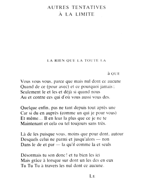 Pas de commentaires LA RIEN QUE LA TOUTE LA, par Morgane Masse Les commentaires sont fermés. LA RIEN QUE LA TOUTE LAexploration à la limite par François Le Lionnais >> OuLiPo, liste des contraintes 27 / 05 / 13