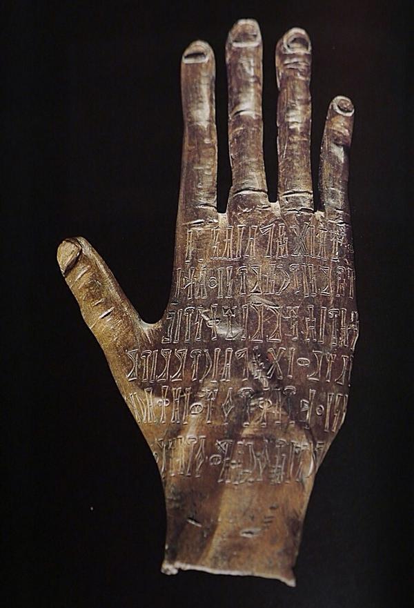 Main droite de bronze à l’échelle 1 dédiée au dieu Ta’lab Riyam, patron des tribus de Su’may, dans un temple pré-islamique du Yemen actuel, entre le 1er siècle avant notre ère et le 2e siècle après. La main votive porte une inscription gravée en abjad sudarabique et en sabéen indiquant qu’elle a été offerte en vœu de bonheur par un certain Wahab Ta’lab. Cette main a été vraisemblablement en partie moulée sur la main droite de ce dernier.