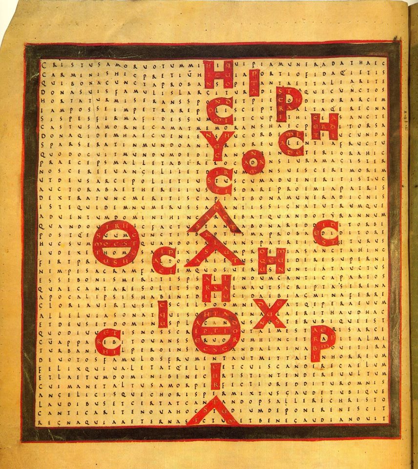Monogramme du Christ en lettres rouges contenant trois vers sur sa prédication, sa louange (au moyen de cet ouvrage) et son statut de Juge. Raban Maur, In honorem sanctae crucis, réalisé à Fulda vers 830-850. Bibliothèques d’Amiens Métropole, ms 223 F, folio 27 verso. Extraite de Louanges de la sainte croix, Paris-Amiens, 1988, p. 90.