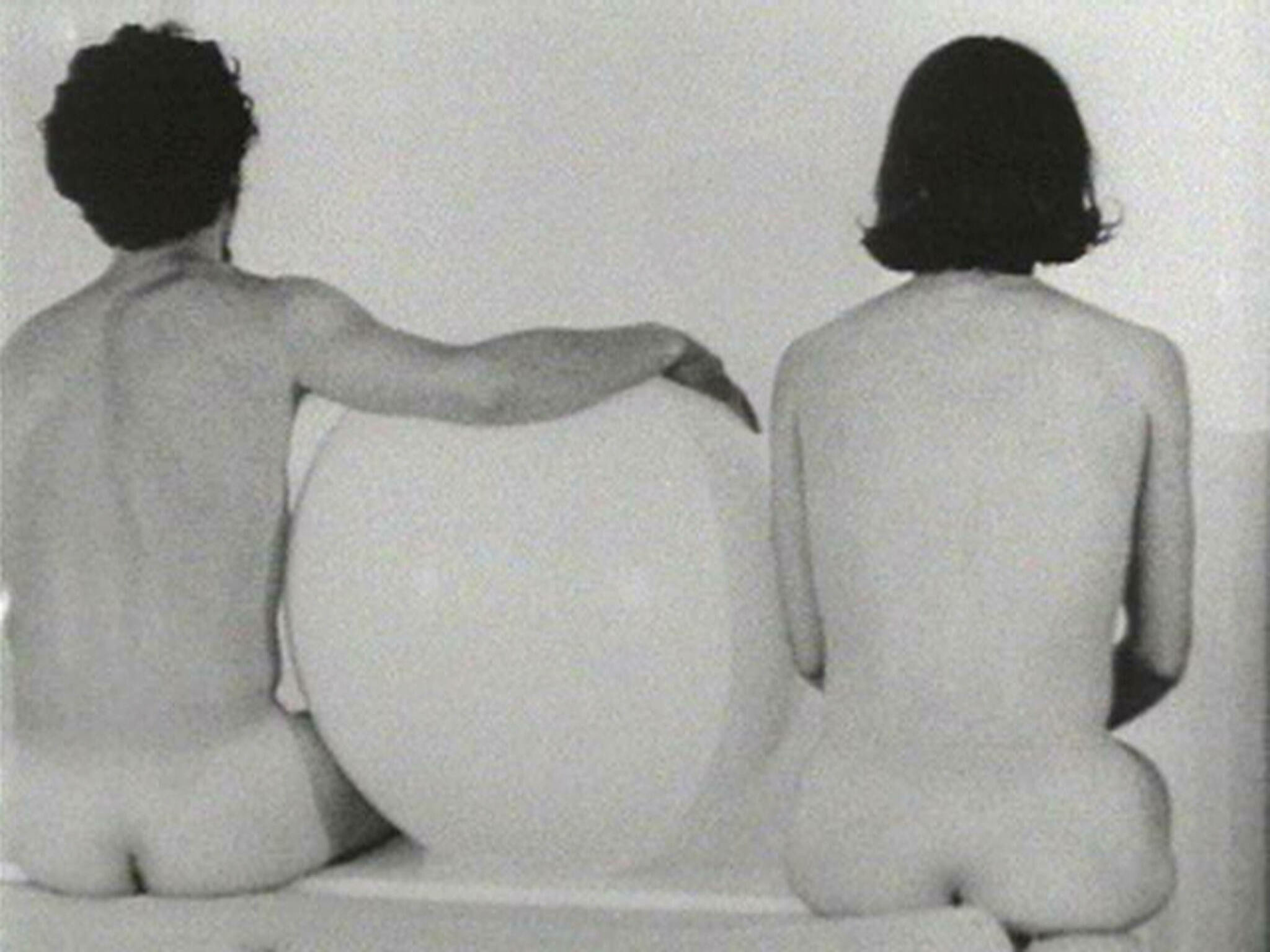 Two nudes, a man and a woman, interact with each other and a large balloon in a white living room. Performed by Steve Paxton and Becky Arnold. Camerawork by Phill Niblock.