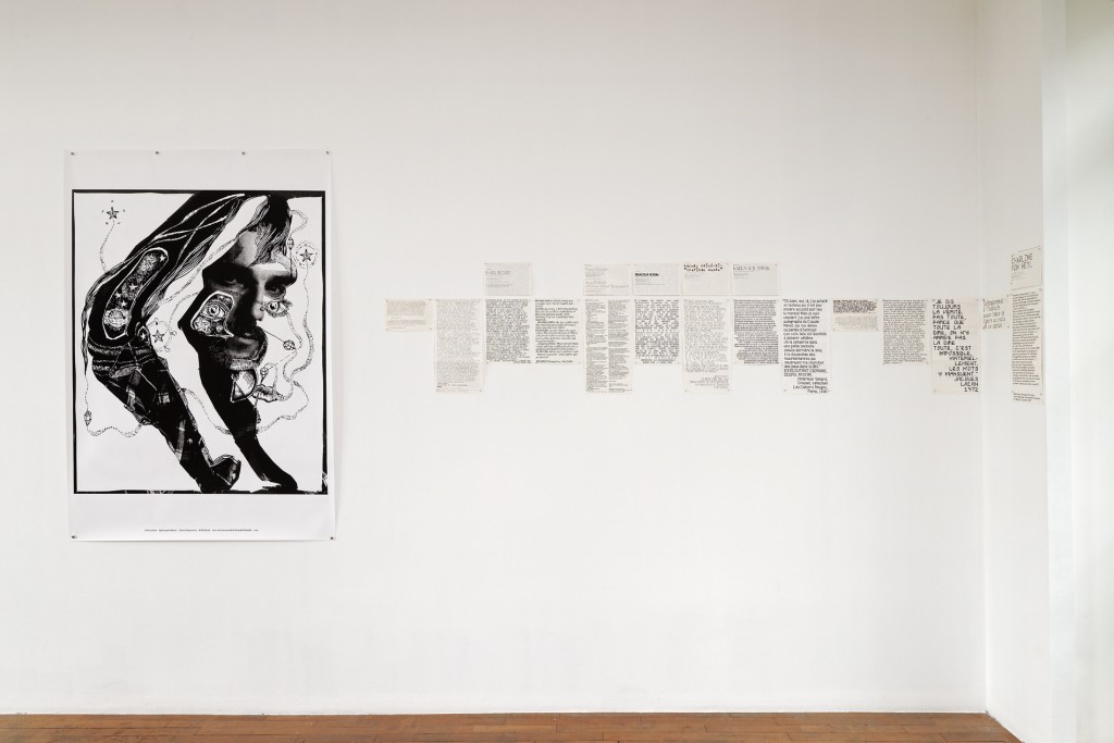 C’est le moment dans l’exposition où le visiteur n’a plus le choix, s’il ne l’a pas fait avant, que d’entrer là sans aucune aide d’aucune sorte. D’abord, une «vue d’ensemble» où l’accrochage et les grands formats prennent le dessus. Ensuite, il faut s’approcher et passer du regard à la lecture en passant à travers le spectre du dessin de lettre. Une boucle se noue. L’exposition commençait, entre autre, par un texte dans une forme tellement conventionnelle (celle du texte littéraire) qu’elle peut passer inaperçue, en tant que forme constituée, aux yeux du visiteur qui va directement à son contenu. Dans un mouvement inverse, celui-ci arrive, à travers leurs caractères typographiques, aux textes sélectionnés par M/M (Paris) pour les invitations du Consortium.