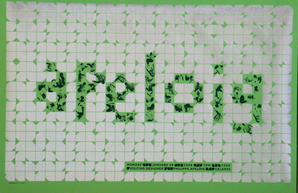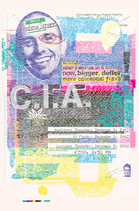 Ce qui est intĂ©ressant de noter câest la diffĂ©rence entre son affiche la plus rĂ©cente (celle dâun workshop quâil organisait Ă la Kaywon School of Art and Design) et son affiche pour la confĂ©rence dâAndy Stevens de Graphic Thought Facility (GTF).