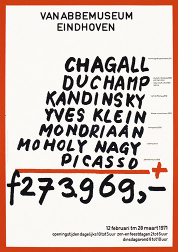 affiche Van Abbemuseum (1971), la typo manuscrite est utilisĂ©e pour imiter le style d’un comptable pas encore passĂ© Ă lâĂšre informatique mais aussi pour souligner l’argent total dĂ©pensĂ© dans les acquisitions du musĂ©e (source : Jason Grant, DesignObservatory 06.06.09). - Dave