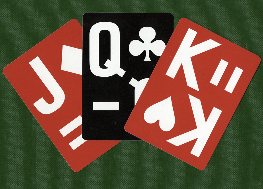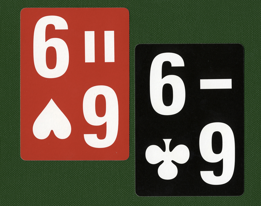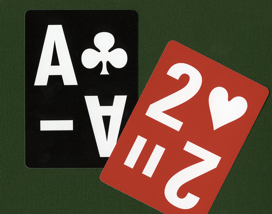 La « basse vision Â» est le terme utilisĂ© pour dĂ©signer le handicap visuel modĂ©rĂ© ou sĂ©vère non amĂ©liorable par mĂ©dicament, lunettes, lentilles ou intervention chirurgicale. Des institutions spĂ©cialisĂ©s2 dĂ©veloppent et Ă©valuent des outils d’aide visuelle. Ces bĂ©quilles3 (loupes, vidĂ©o-agrandisseurs, logiciels…) constituent des prothèses adaptĂ©es au handicap, permettant aux patients de se mouvoir et d’interagir avec leur environnement quotidien. Certaines applications nĂ©cessitent des solutions strictement formelles, Ă  l’instar de ce jeu de cartes « EZC Â» (pour « Easy See Â»). Les cartes sont imprimĂ©es en deux tons noir et rouge, les Ă©lĂ©ments graphiques et typographiques sont d’un corps gĂ©nĂ©reux, en rĂ©serve et un vocabulaire graphique spĂ©cifique indique les enseignes (trèfle â€”, carreau =, coeur ||, pic |).