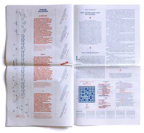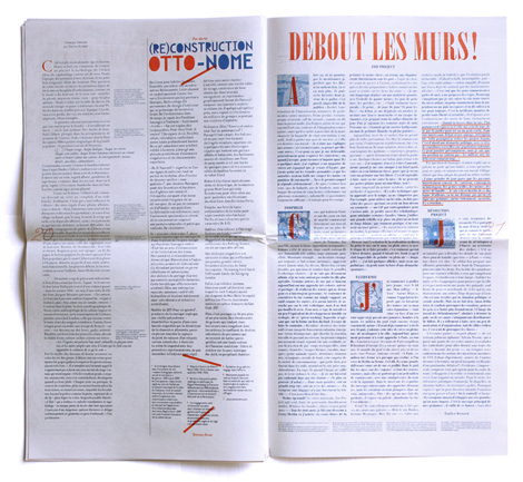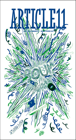 Article 11 est donc ce journal dĂ©libĂ©rĂ©ment autre qui profite dâun traitement graphique distinguĂ© : format trĂšs allongĂ©, 24*44 cm, impression en bichromie bleu foncĂ© et couleur variable, travail typographique subjectif et mouvant au fil de chaque article, prĂ©sence gĂ©nĂ©reuse dâimages, Ă©videmment organiques, et sâaffirmant au delĂ de tout traitement trop illustratifâŠ