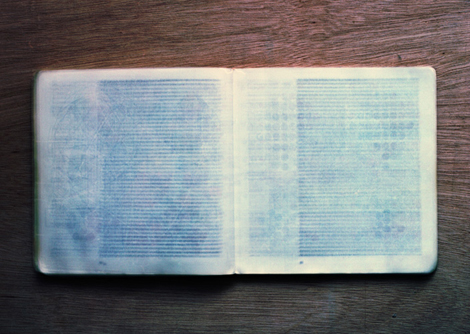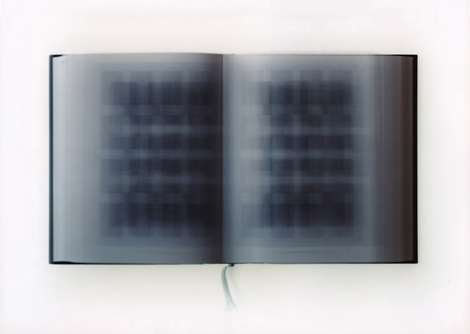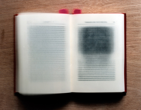 Dans sa série Burning with desire, Katja Mater photographie tout le contenu de livres sur un même négatif. Cette sorte de palimpseste mené à l’échelle de l’ensemble d’un ouvrage, en se donnant l’ambition de délivrer le tout d’un contenu, l’efface paradoxalement, rappelant la définition du bruit blanc chez Umberto Eco qui n’est pas l’absence d’information, mais au contraire, sa saturation…