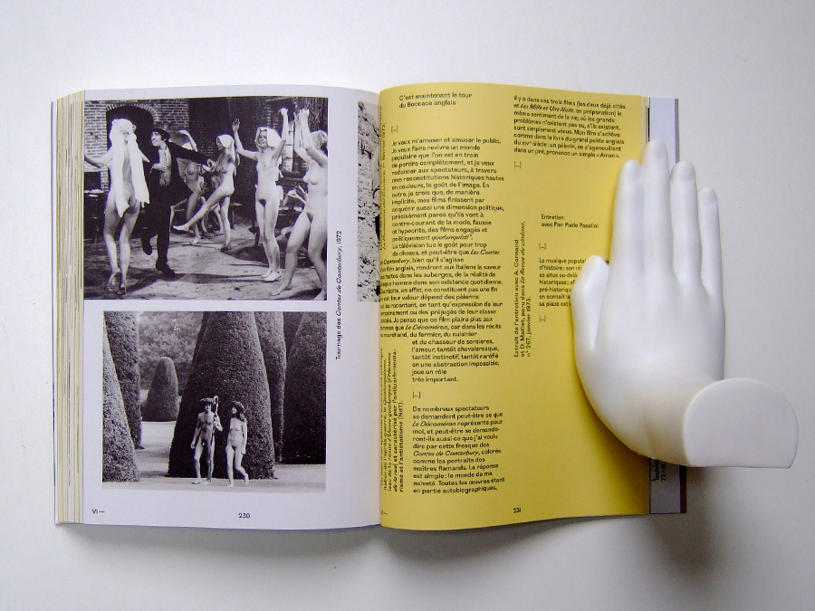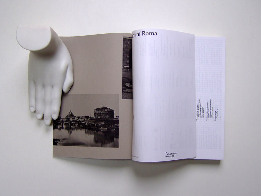 Le cinéma peut aussi se retrouver dans la rythmique des rubriques du livre. Une structure narrative ou logique accusée par des différences des matières et des couleurs du support papier. Noir, lumière, valeurs de gris. Contrastes des corps typographiques, défonces. Cut, panneau, iris, fondu.