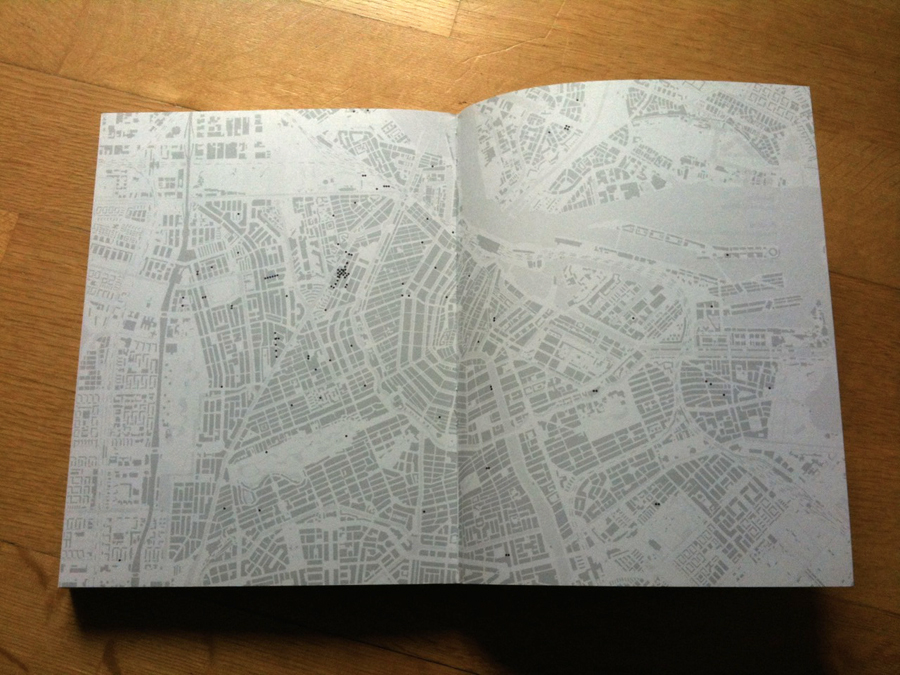 Si lors de premières lectures, le livre peut paraître austère, très vite, sa logique signalétique devient une opération fascinante. Chaque portrait a pour légende un point et cette surface, infime et précise, rattache le photographié à sa position géographique au sein d’Amsterdam. La plupart des individus de City People habitent à gauche par rapport au pli du plan, ainsi leur portrait est-il placé sur la page de droite (et vice versa). Ce face-à -face rythme les pages. D’un côté, un portrait (qui fige, par l’indice photographique, un instant d’humanité, un visage qui n’existe plus déjà , à l’identique). De l’autre, un pointeur noir, marqueur de déterminations géo-socio-économiques.