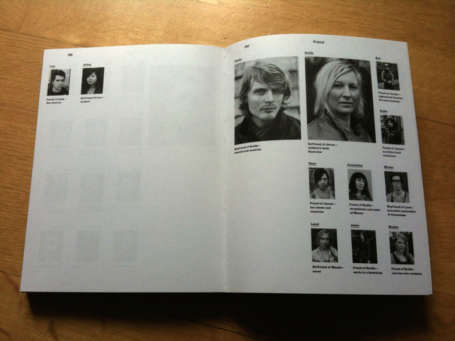 Les portraits sont rangés en chapitres, non pas par zone, mais par lien de parentés (Friend, Son, Neighbours…). Dans le système d’archivage mis en place par Hans Gremmen, les pages sommaires s’avèrent des commentaires essentiels. Sans ces pages liminaires, qui s’étalent ostensiblement, j’aurai regardé distraitement ces individu(e)s.