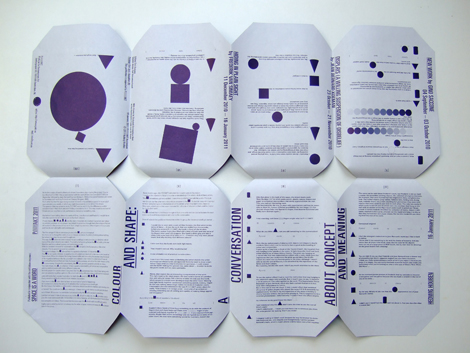 Par exemple Hedwig Houben prend son travail comme sujet. Dans des performances-conférences, des vidéos plus ou moins documentaires ou au sein d’imprimés (Illustrations : Colour And Shape, A Conversation About Concept And Meaning, 2011, graphisme Raf Vancampenhoudt), elle commente avec fraîcheur et humour sa pratique. Son activité professionnelle comme un processus de production, avec ses errances, ses difficultés, ses échecs. Sa raison sociale comme un effort absurde, drôle et tragique pour qu’adviennent des formes et du sens…