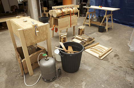 Un atelier manifeste qui organise les flux énergétiques de vapeur et de poétique intelligente et facétieuse entre la production de chaises en bois cintré, de toute une galaxie de documentations graphiques assurée par Olivier Lebrun ou de repas pour tous concoctés par Maori Murota…