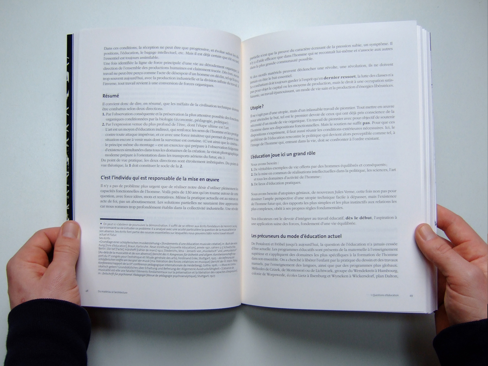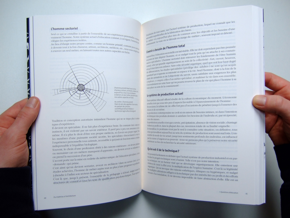 D’abord il faut féliciter le projet ambitieux et nécessaire de traduction en français du dernier Bauhausbücher de 1929 Von Material zu Architektur. Il aura fallu attendre près de 80 ans pour que cet ouvrage acclimaté dès 1930 aux États Unis sous le titre The new vision et réédité quatre fois depuis, réimprimé de nouveau en Allemagne en 2001 dans la série des Neue Bauhausbücher, soit enfin disponible dans notre belle langue des lumières. Et cet ouvrage n’est pas du tout anodin : ultime production de cette collection d’éditions du Bauhaus qui comptait Oskar Schlemmer, Kasimir Malevitch, Wassily Kandinsky ou Paul Klee, l’édition se fait non seulement l’écho encore bien vivant du lieu primitif de nos disciplines des arts appliqués à l’industrie, à l’économie, à la vie, mais elle constitue surtout une sorte de testament. Le testament esthétique du plus jeune enseignant du Bauhaus, rédigé alors qu’il venait de quitter l’école notamment parce qu’il la sentait en voie d’académisation, sous les pressions des politiques de droite et d’extrême droite. Ce livre qui n’a pas été nommé dans sa version étasunienne The new vision pour rien, propose effectivement non seulement un succédané un brin hétéroclite de la pédagogie humaniste de László Moholy-Nagy, mais aussi toute la fraîcheur optimiste d’une esthétique. Une esthétique constructiviste teintée de dadaïsme expérimental et de machinisme bricoleur et organique, voire une morale de l’adaptation de l’homme « total » à l’industrie et à la modernité, via une nouvelle poétique de la vie des formes, de la lumière, des matériaux, de la technique et de l’expérience sensible. Il faut le dire, ce livre qui devait originellement s’appeler De l’art à la vie propose une leçon formidable.