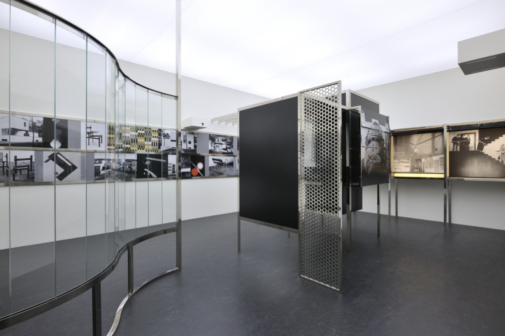 Une des caractérisques des compositions typographiques de la neue typografie, au delà des textes non justifiés respectant les réglages optiques des typographies, au delà de la prédilection du système des différences de la bas de casse qui va jusqu’à interdire toute hiérarchisation à l’antique de la capitale toujours vaguement lapidaire et romaine, c’est une machine optique constructiviste qui fonctionne grâce au contraste exacerbé de matériaux visuels réduits, concentrés, comme une pile, comme un moteur. Une structure forte des différences privilégiant les effets de décentrement afin d’autoriser, de susciter, la plus grande liberté de mouvement des yeux et de l’esprit. Et de la double page à cet autre espace de vision qu’est la machinerie d’exposition, il faut sans doute se rappeler que Moholy Nagy, artiste appliqué total, travailla en 1930 à la réalisation d’une Gegenwart5 avec Alexander Dorner, directeur du musée de Hanovre qu’il considérait comme un « nouveau type de structure ressembl[ant] davantage à une centrale électrique, à un créateur d’énergies nouvelles ».