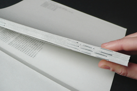 Les agrafes ont été placées de façon décalée volontairement en vue d’assurer une épaisseur homogène tout le long du dos.Après avoir réalisé plusieurs essais non-concluants chez différents brocheurs en Belgique, nous avons dû faire appel à un brocheur hollandais pour réaliser l’encollage à froid tel que nous l’envisagions. »