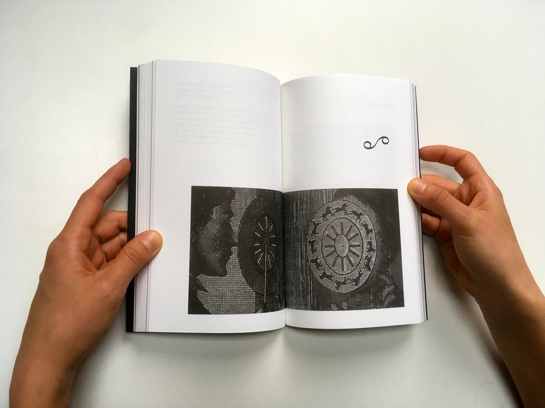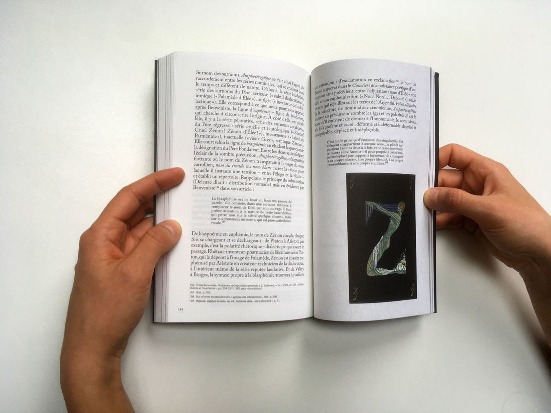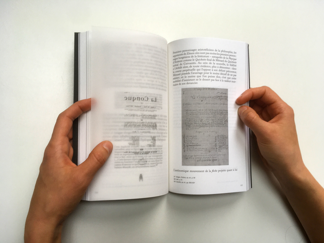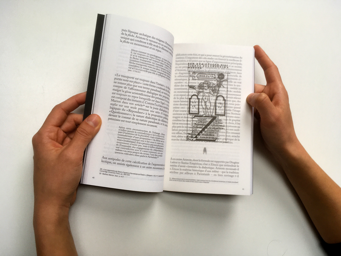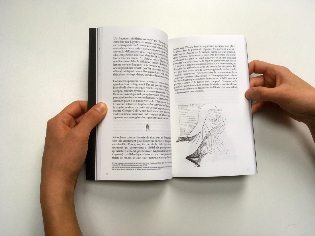 La cigale par les ailes comporte huit chapitres, traversant la vie de Zénon et de sa pensée, à travers des mots et des écrits de Samuel Beckett, Paul Valéry, Jorge Luis Borges, Gilles Deleuze et Roland Barthes. La voix de l’auteur est là , et on a le sentiment qu’il est à nos côtés, émerveillé comme nous face à ce que le livre nous raconte. Nous sommes aussi accompagnés par la graphiste Marion Cachon, qui donne forme aux idées de Nicolas Pineau, créant un jeu entre le texte qu’on lit, le texte qu’on voit et le livre qu’on manipule. L’auteur, les auteurs, du texte et du livre, nous pointent des détails ici et là , guidant notre regard vers des fragments et vers l’ensemble.