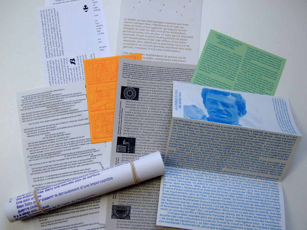 Puis cette sĂ©lection de textes Ă©tablie dans un rapport oblique et ouvert avec les revendications, renouvelĂ©e pour chaque Ă©vĂ©nement, vient prendre place sur les attaches fragiles du bâton devenu support et emblème de la manifestation, de l’Ă©mergence publique des formes qui peuvent constituer la place publique. Les textes se fichent, s’affichent, s’envolent Ă la rencontre d’un nouveau public. Le bâton de parole et de lecture devient le support lĂ©ger de la rencontre, de l’échange, de l’information, de la rĂ©flexion et de l’individuation.
