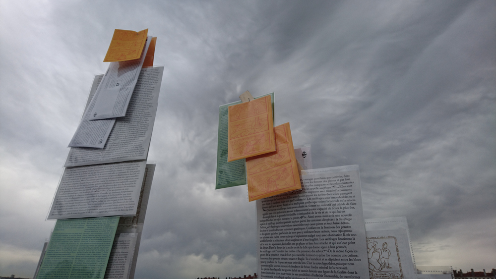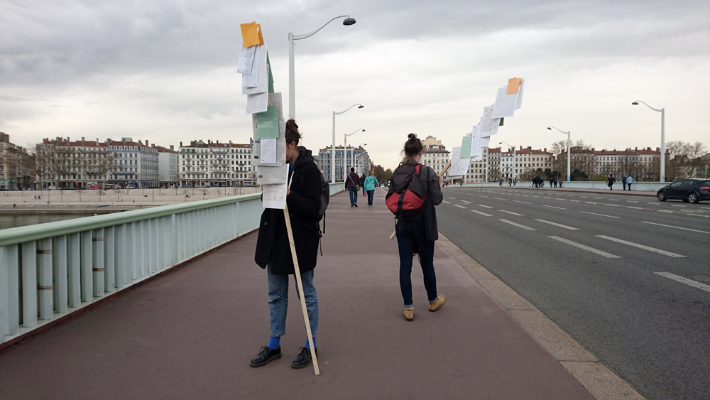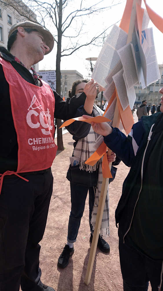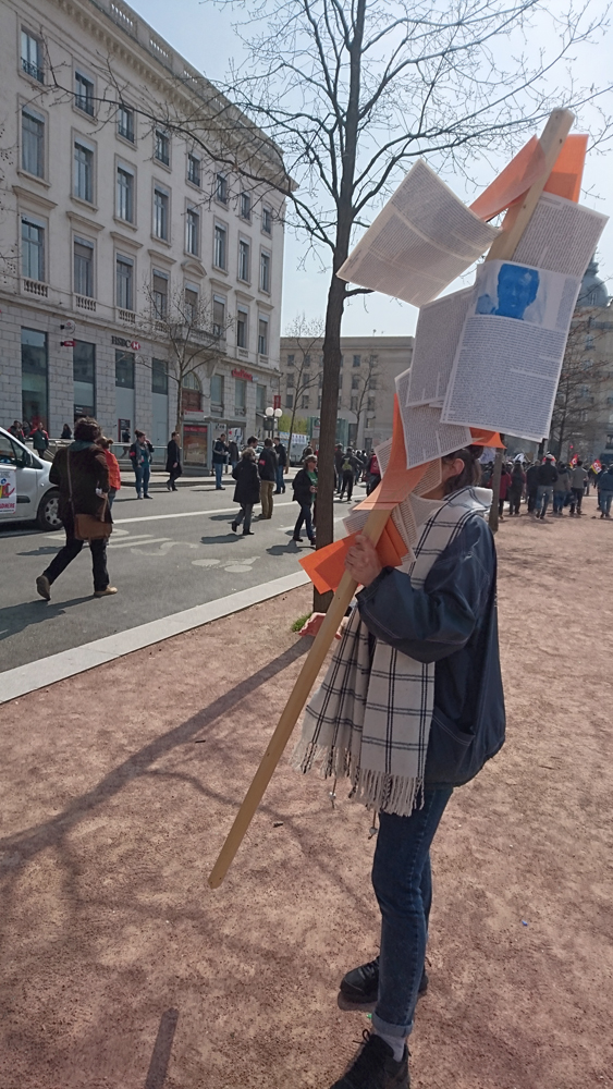 Inventer un format n’est pas chose facile. C’est pourtant ce que viennent de réussir Anouk, Mona et Morgane, trois étudiantes en art ou en design graphique des écoles des beaux arts de Lyon et de Valence, lors des derniers mouvements sociaux lyonnais. De longs bâtons fichés de textes multicolores devenaient à la fois des étendards et des supports proprement éditoriaux des mouvements sociaux et politiques du moment.