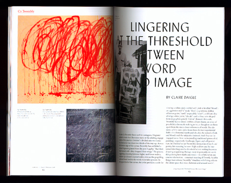 Blancs extrêmement mouvants, grilles simplissimes, rectangles d’empagement très pleins, presque sans marge, esthétique retenue du choc des effets de superposition, raffinement d’un traitement qui distord les conventions typographiques classiques (fers à gauche avec retraits d’alinea, décalages plasticiens des entrées de ligne bloc…), intégration de typographies vernaculaires ou kitsch dans l’espace de la tradition typographique latine de classe. Mise en page qui rejoue l’espace de médiation et de composition du white cube. Retour à l’ordre subtil d’un classicisme qui aurait englobé les leçons de la radicalité moderniste et la polyphonie dandy de la postmodernité intellectuelle et citationelle… Bref, un fonctionnalisme suisse rénové.