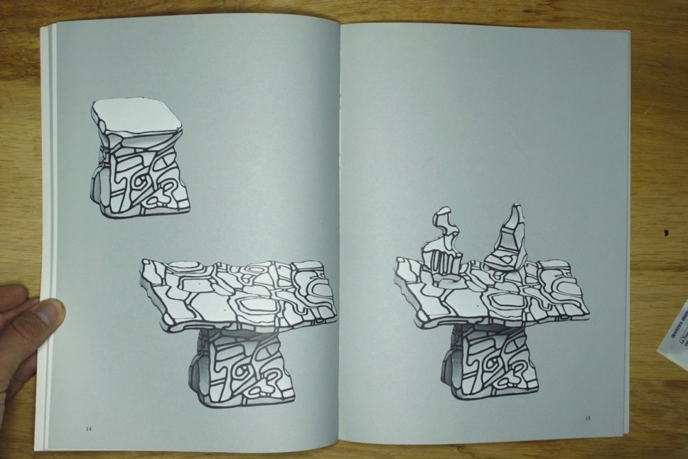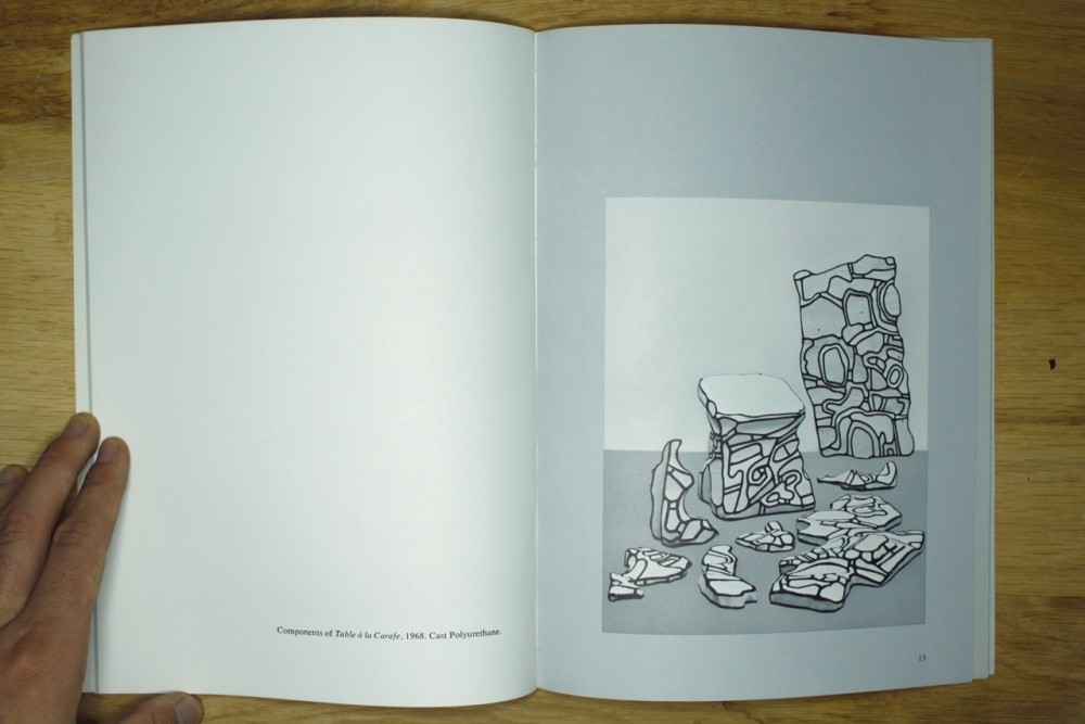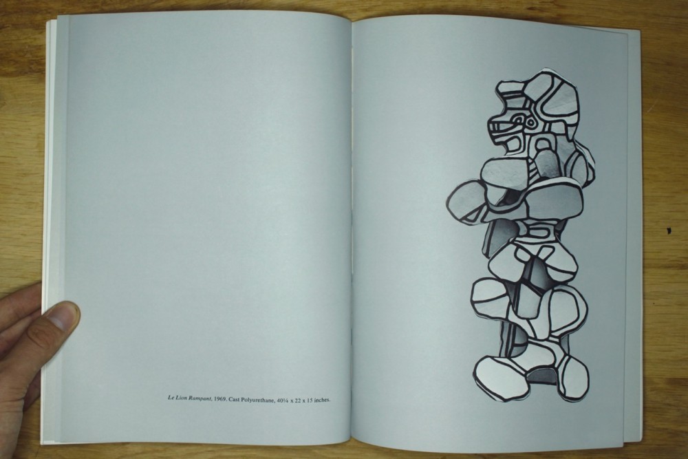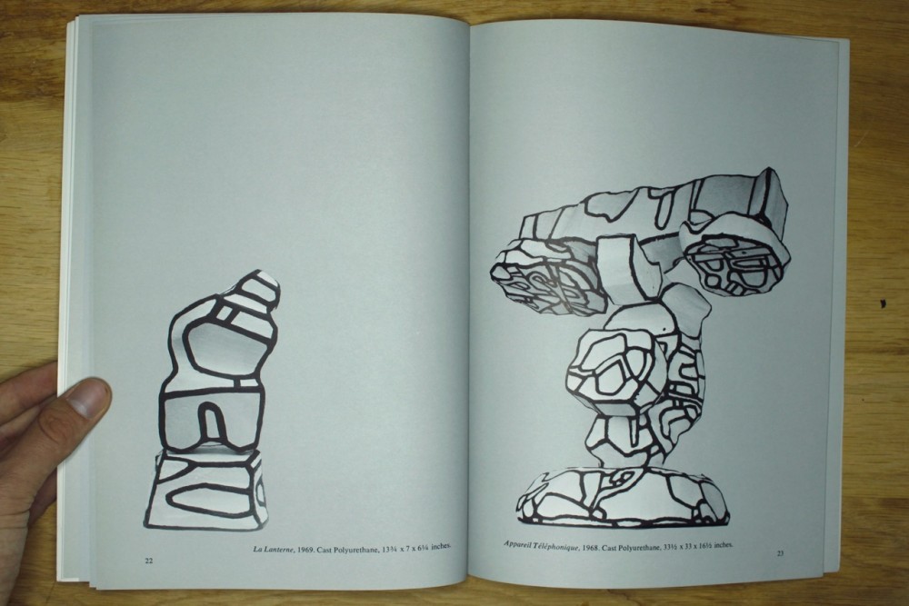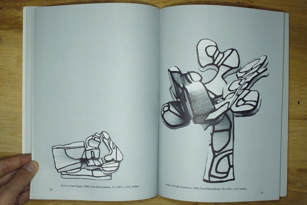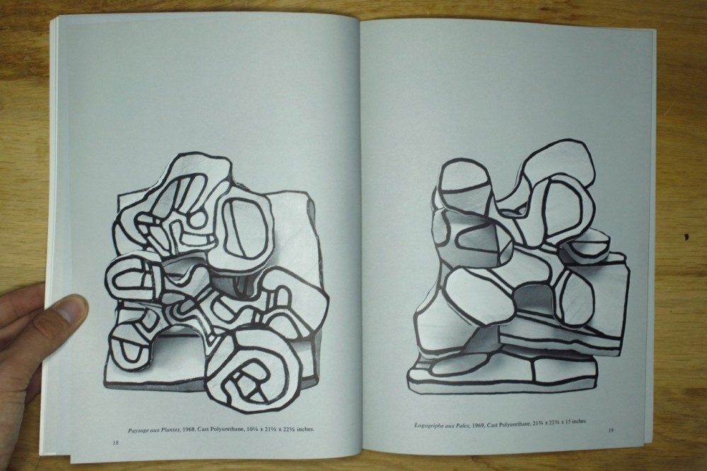 En considĂ©ration de ce qui prĂ©cède j’ai envisagĂ© de donner aux ouvrages prĂ©sentĂ©s dans votre exposition le nom de Logogriphes qui est formĂ© du mot logos associĂ© au mot grec dĂ©signant un filet ou par extension, une Ă©nigme. Mais ce terme pourrait s’appliquer indiffĂ©remment Ă  toutes les figures de L’Hourloupe —à celles du jeu de cartes notamment— et il ne rend pas assez compte des particularitĂ©s que prĂ©sentent les sujets qui sont cette fois montrĂ©s: celle d’ĂŞtre exĂ©cutĂ©s non sur une toile plane mais sur des solides tridimensionnels; celle aussi de ne comporter que de simples tracĂ©s noirs sur des fonds blancs; celle d’ĂŞtre constituĂ©s de pièces amoncelĂ©es les unes sur les autres; celle surtout, d’ĂŞtre dotĂ©s d’un statut Ă©quivoque, dont rĂ©sulte une indĂ©cision entre la fonction d’objets matĂ©riels et celle d’immatĂ©rielles figurations d’objets. Je veux m’expliquer sur ce point important dont je crains qu’il apparaisse d’abord obscur. Quand un peintre figure une chaise, interprĂ©tant et dĂ©naturant l’aspect de celle-ci Ă  son caprice, aucune confusion n’en rĂ©sulte pour le regardeur du tableau entre la figuration proposĂ©e et la chaise rĂ©elle Ă  partir de laquelle a opĂ©rĂ© le peintre. Si maintenant cette figuration n’est plus seulement peinte sur une toile, mais Ă©rigĂ©e en un objet tridimensionnel, l’esprit du regardeur est alors enclin Ă  ne plus y voir un ouvrage mental —l’interprĂ©tation mentale d’une chaise— mais bel et bien un objet physique: une nouvelle chaise qui lui est offerte pour s’y asseoir. Dans le cas des ouvrages qui donnent lieu Ă  notre exposition il s’agit, bien sĂ»r, d’Ă©vocations strictement mentales. La matĂ©rialitĂ© dont ils sont dotĂ©s est spĂ©cieuse; elle ne saurait ĂŞtre un instant prise Ă  la lettre. Ils sont des Ă©rections matĂ©rialisĂ©es de productions mentales. Leur objectivation est fallacieuse. Ils sont des matĂ©rialisations d’opĂ©rations mentales tout Ă  fait Ă©trangères au monde des corps, au mĂŞme titre —et plus encore sans doute— que l’est, au regard du spirite, l’ectoplasme. C’est par lĂ  qu’ils n’appartiennent pas, me semble-t-il, au registre de la statuaire, mais plutĂ´t Ă  celui de la peinture: peinture Ă  laquelle a Ă©tĂ© cette fois insolitement donnĂ© corps, peinture corporalisĂ©e, objectivĂ©e. C’est pour marquer cet aspect particulier —très particulier— de ces travaux que j’ai pensĂ© un moment Ă  leur donner le nom de Figures-corps, ou celui de «Semblances-substances». ou encore, pour expliciter la mise en Ĺ“uvre qui y est faite de seuls graphismes noirs Ă  l’exclusion d’aucun coloriage, celui de Graphies-corps-prenant. J’avais aussi retenu le nom —evidemment trop long— de DĂ©rives mentales dotĂ©es de corps physique.