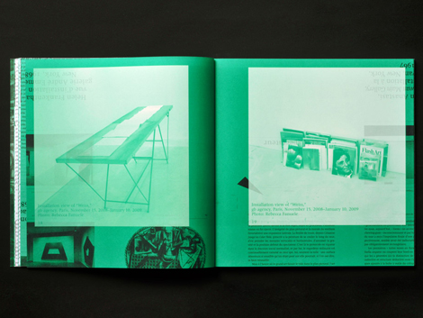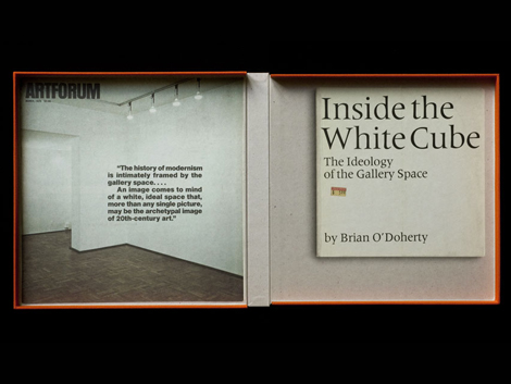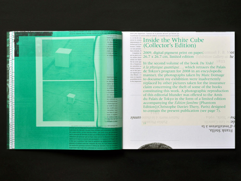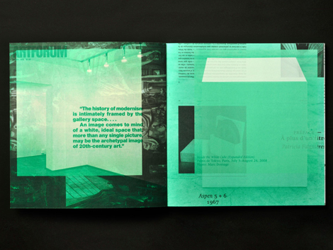 De mĂȘme, le projet typographique quâil a dĂ©veloppĂ© rĂ©cemment avec Yann SĂ©randour, Inside inside the white cube, sâattaque Ă une appropriation rĂ©flexive des matiĂšres Ă©ditoriales et musĂ©ales de la mĂ©diation culturelle. Il construit tout un Ă©cheveau de rĂ©fĂ©rences contextuelles et documentaires autour de lâessai emblĂ©matique de Brian OâDoherty, qui questionnait avec provocation, en 1976, les thĂ©ories modernistes de lâautonomie de lâart. Le livre produit une sĂ©rie de calques de sens, et de documentation de lâhistoire Ă©ditoriale du texte, qui se rĂ©solvent en un explicite palimpseste. Le format Ă©pouse celui dâArtforum, dans lequel parurent initialement les articles dâOâDoherty. La typographie (un MĂ©ridien de ce bon Adrian Frutiger) et le rectangle dâempagement citent les conventions typographiques de Jack W. Stauffacher pour lâĂ©dition de 2000 aux Ă©ditions University of Califormia Press. Enfin, lâouvrage mime la surimpression sur la réédition du texte, en 2008, aux Presses du rĂ©el sous l’Ă©gide de No-do (illustrations 3 Ă 7).