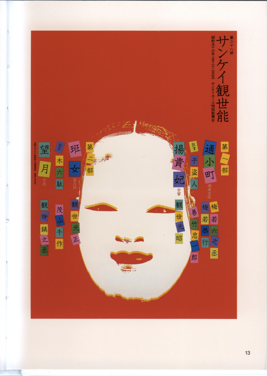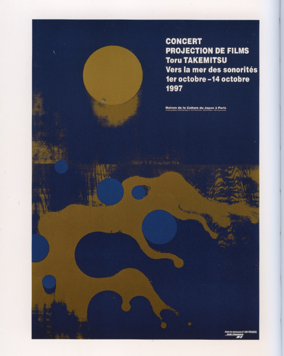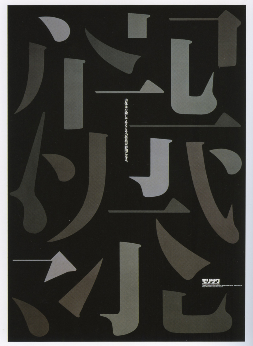 Selon quelle logique fonctionne l’affiche pour Morisawa, les composants d’un kanji étant éclatés sur la surface ? Le kanji est-il encore lisible ? Son éclatement joue-t-il une polysémie ? Ou bien est-ce une pure composition visuelle ? On serait alors tenté d’y voir autant de partitions de musique contemporaine, à interpréter librement mais rigoureusement – ainsi les signes de l’affiche dessinée pour Toru TAKEMITSU (Music Today, 1985) : la musique matérialisée par un flux porte les indications à interpréter. Des nouveaux kanji géométriques et colorés comme autant de notes ? Il n’est pas jusqu’aux aplats que l’on soit tenté d’attribuer un sens ou aux corps que l’on tâche de lire comme autant d’éléments constituant un kanji.