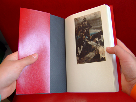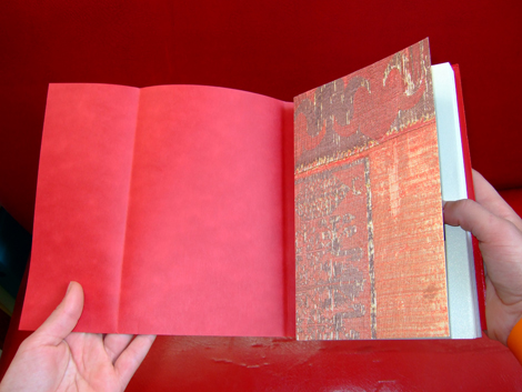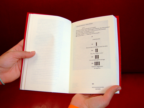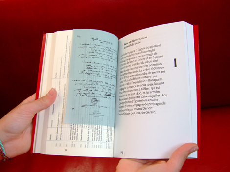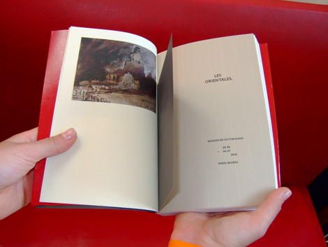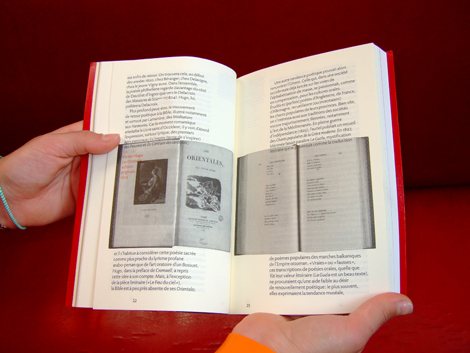 Bibliophilie savante, comme cet effet de reprise du format de l’édition originale du recueil de 1829. Sens du détail, variation raffinée des grilles, des caractères, des effets de papier, de texture, d’impression qui amènent aussi une structuration des contenus. Jeux maniéristes comme cette apparition du tapis persan sous la couverture classique en simili cuir, ou ce poster central qui joue la sensualité de la figure de l’orientalité lascive, tout en présentant un monochrome rouge cardinalice ou rouge turc. Refus de la représentation des corps et couleur christologique. Colonialisation, Orient et Occident…
