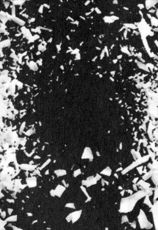 L’exposition de Thomas Petitjean et Julien Hourcade ne présente donc volontairement pas de livre mais une série de 5 posters grand format, édités à 500 exemplaires et laissés à la disposition des visiteurs. Ces 5 images sont autant de zooms, brusques recadrages au plus près des trames, dans les pages de 5 livres réalisés (et choisis pour l’occasion) par Hey ho.L’identité des contenus s’évanouit, seule reste une gamme de textures. C’est alors, bien qu’excédée, une image qui contient le livre plutôt qu’un livre qui contient des images.