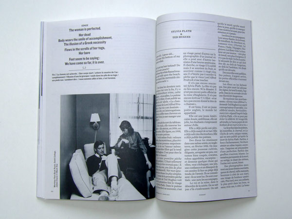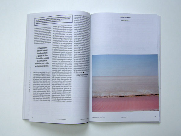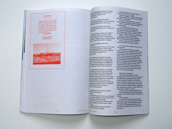 Un journal qui se contracterait et se diluerait au format des 127 pages d’un grand poche piqué. Des grotesques de titrage, étendues, contractées, des réales de labeur, des filets, du rouge, du noir, couleurs du signe. Des jeux de décadrage, des chapos, des encadrés, de courtes et denses colonnes en apesanteur, qui joueraient avec la cinétique et le blanc des pages.