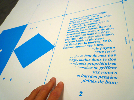 En tous cas d’un livre ouvert à ses publics. D’abord parce que son fonctionnement par stratification complexe d’information autorise et favorise sa manipulation et sa réappropriation par les gentilléens. Ensuite parce que Les planches d’impression recto/verso seront exposées à chaque « état » de leur impression dans des présentoirs conçus spécifiquement et placés dans des lieux publics de la ville. De septembre 2009 à juin 2010, chaque mois des neufs de la gestation de l’ouvrage, sera imprimé une partie du livre en sérigraphie dans une couleur différente qui sera livrée à la collaboration des habitants de Gentilly.